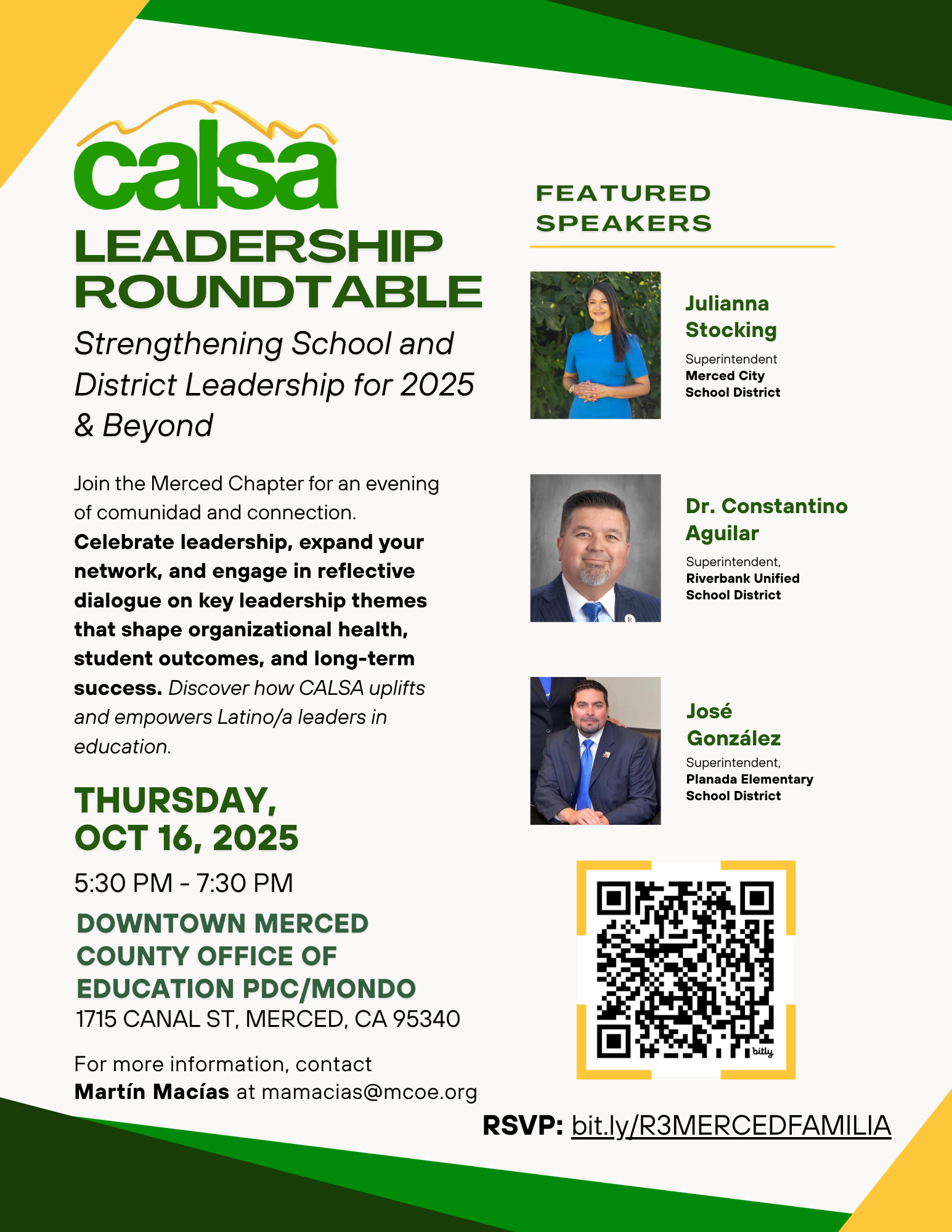 Join the Merced Chapter for an evening of comunidad and connection. Celebrate leadership, expand your network, and engage in reflective dialogue on key leadership themes that shape organizational health, student outcomes, and long-term success. Discover how CALSA uplifts and empowers Latino/a leaders in education.